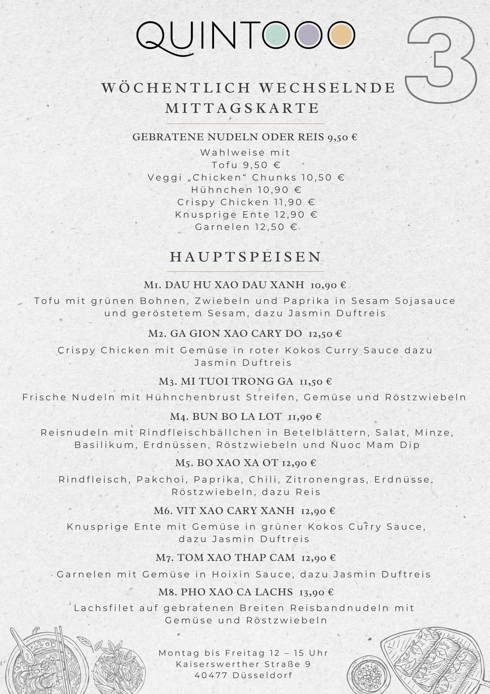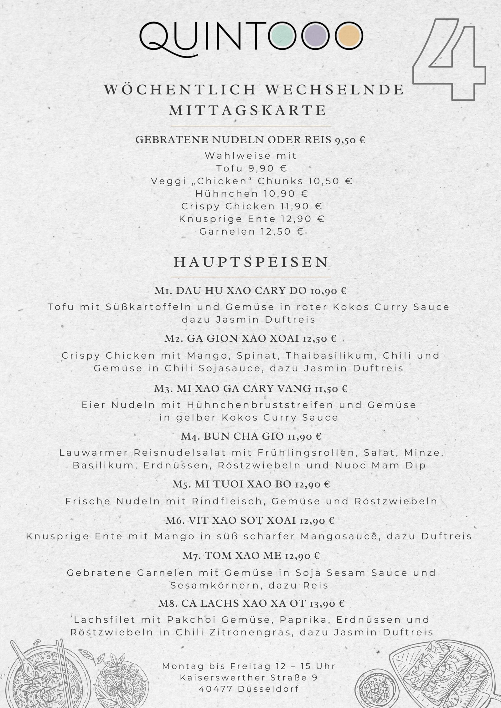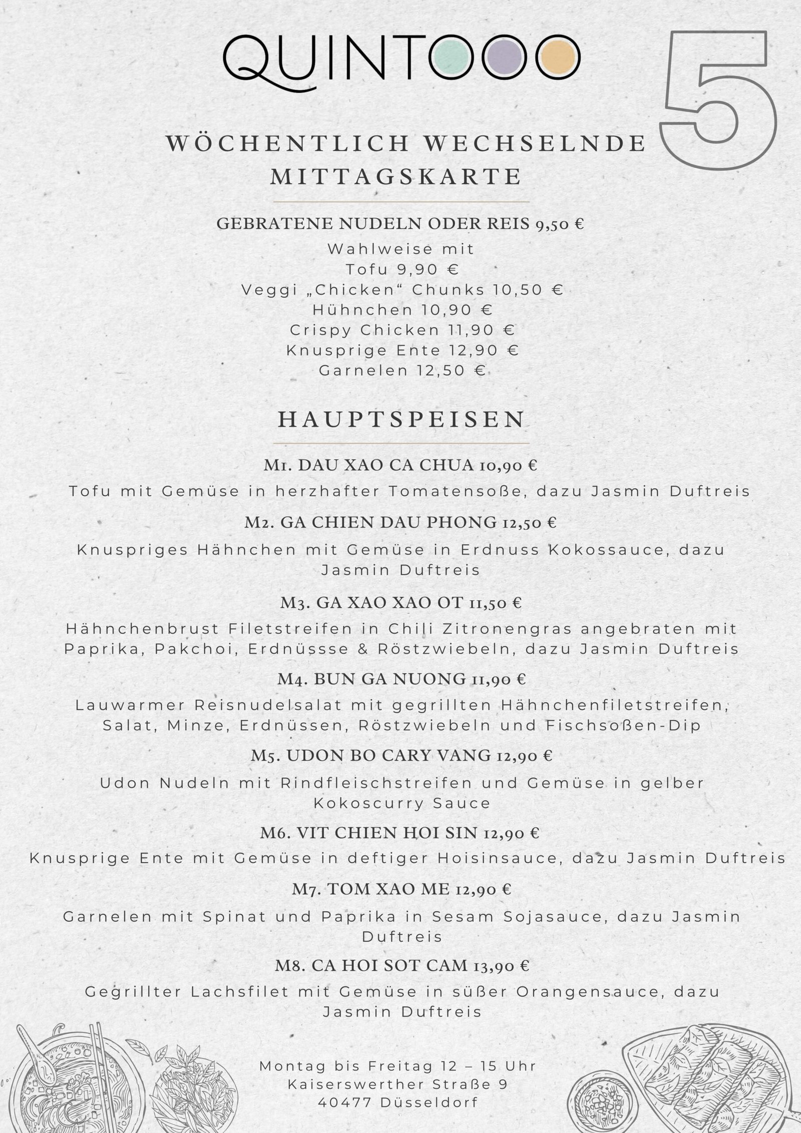 Das Quintooo ist ein vietnamesisches Restaurant dessen Herzstück unsere leckeren Mon khai vi sind. Die Idee der Mon khai vi sind vietnamesische Tapas zum gemeinsamen probieren und teilen. Eine Sammlung authentischer vietnamesischer Gerichte. Alte, traditionelle Rezepte findet man hier ebenso wie die Snacks der Straßenküchen sowie die frischen Ideen junger vietnamesischer Restaurantköche. Dazu gibt es bei uns natürlich auch leckere vietnamesische Hauptgerichte und Desserts. Jede Woche gibt es eine neue Mittagskarte mit abwechslungsreichen Menüs. Sie haben eine Feier? Dann fragen Sie unser Personal nach unserem Catering-Angebot.