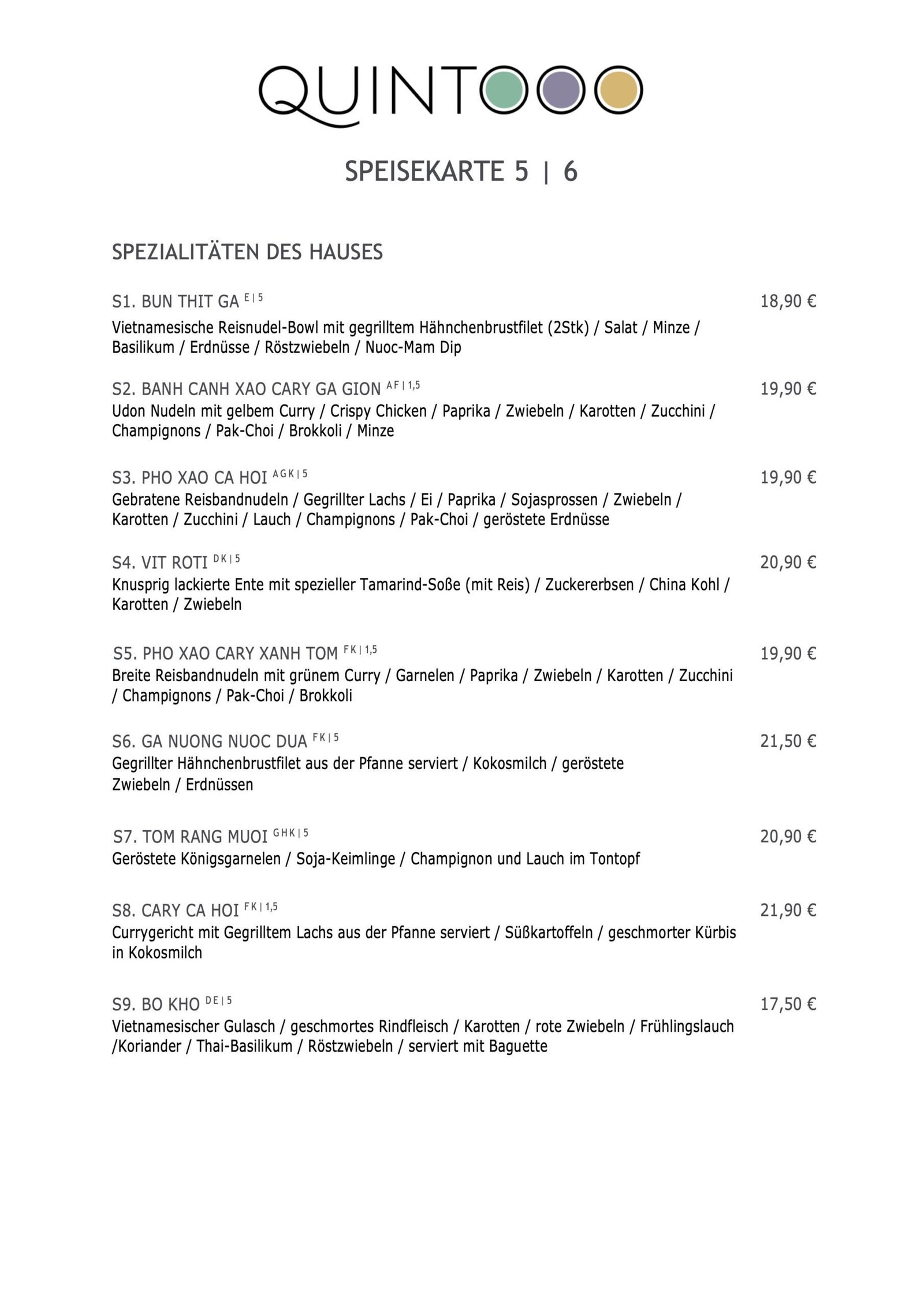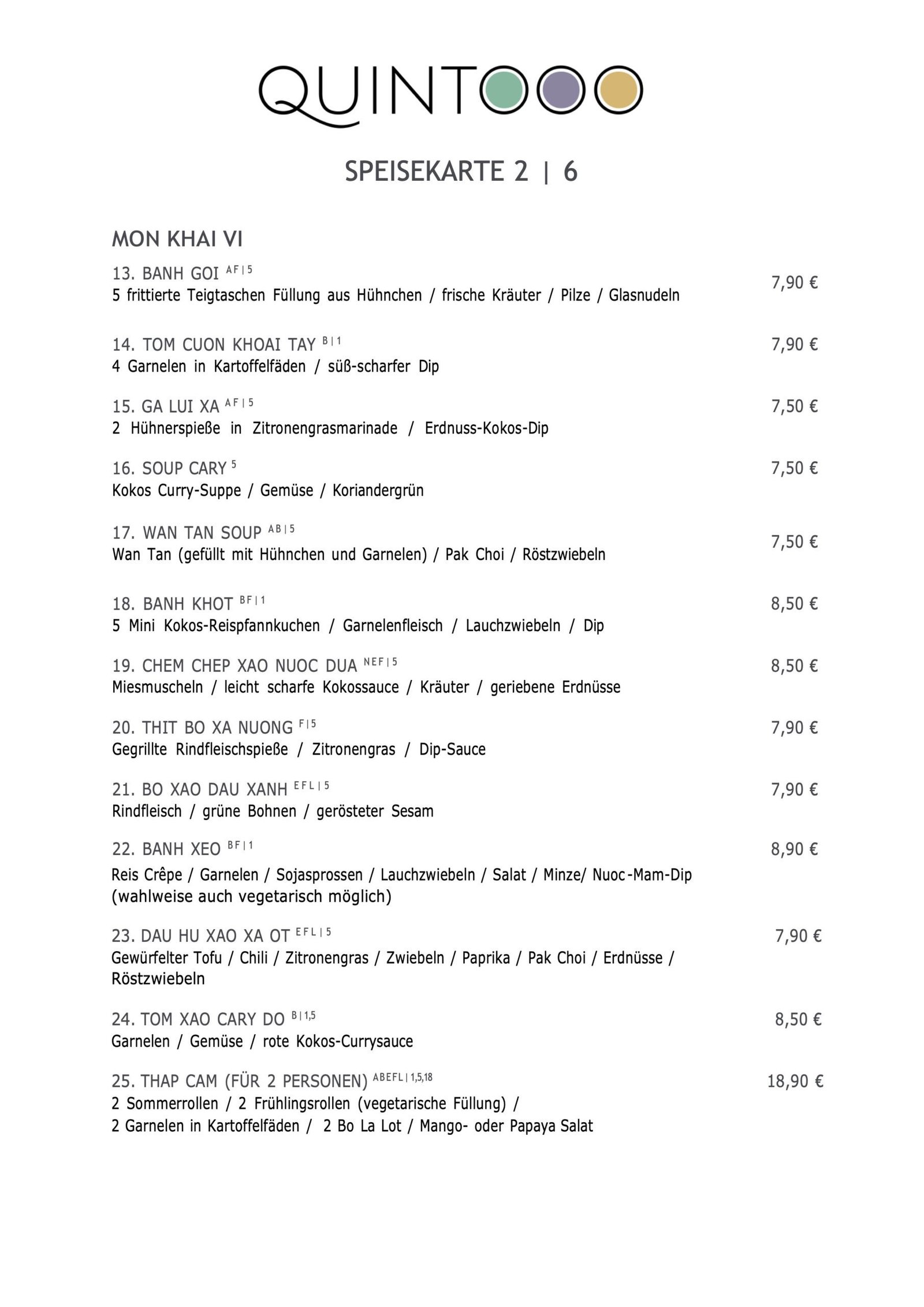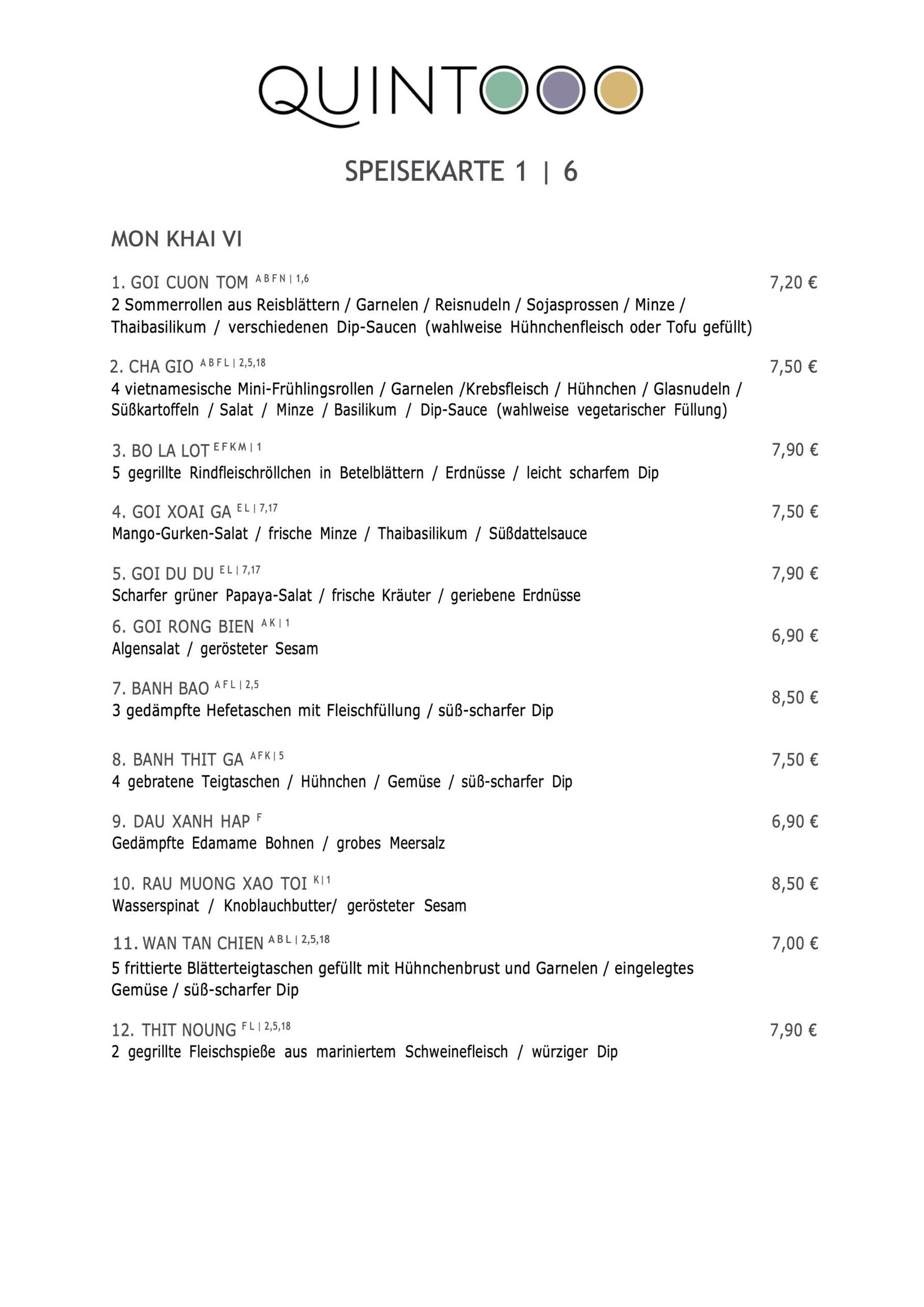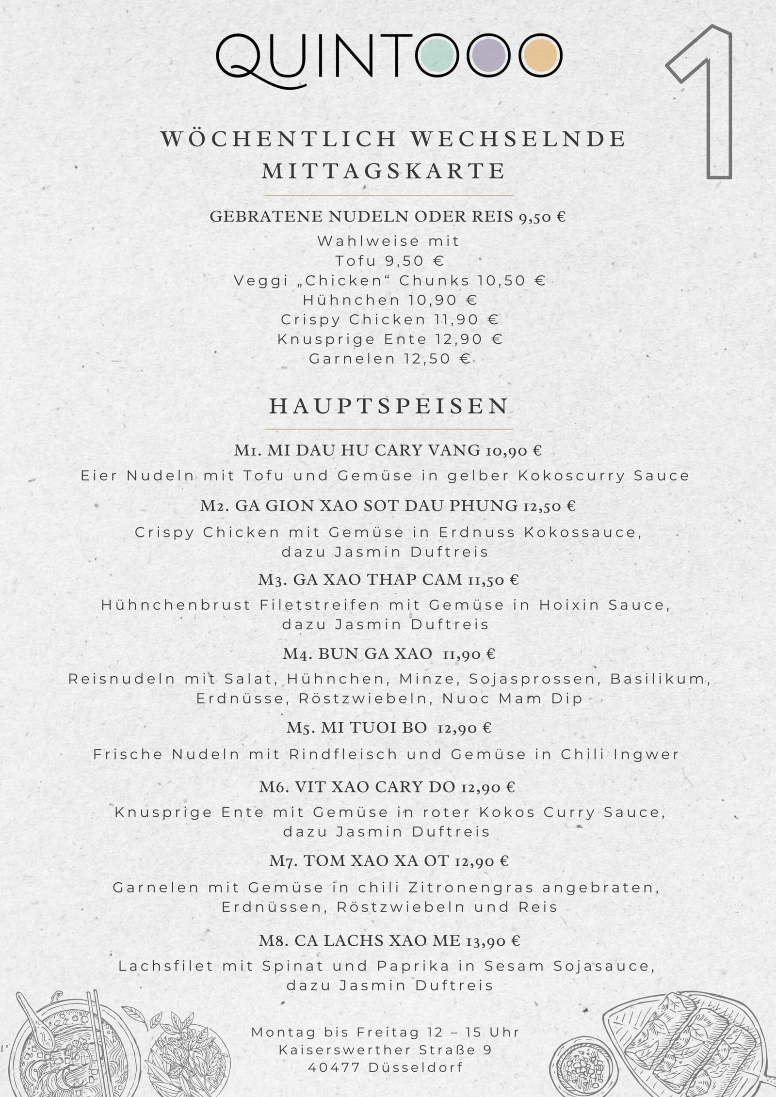 Das Quintooo ist ein vietnamesisches Restaurant dessen Herzstück unsere leckeren Mon khai vi sind. Die Idee der Mon khai vi sind vietnamesische Tapas zum gemeinsamen probieren und teilen. Eine Sammlung authentischer vietnamesischer Gerichte. Alte, traditionelle Rezepte findet man hier ebenso wie die Snacks der Straßenküchen sowie die frischen Ideen junger vietnamesischer Restaurantköche. Dazu gibt es bei uns natürlich auch leckere vietnamesische Hauptgerichte und Desserts. Jede Woche gibt es eine neue Mittagskarte mit abwechslungsreichen Menüs. Sie haben eine Feier? Dann fragen Sie unser Personal nach unserem Catering-Angebot.
